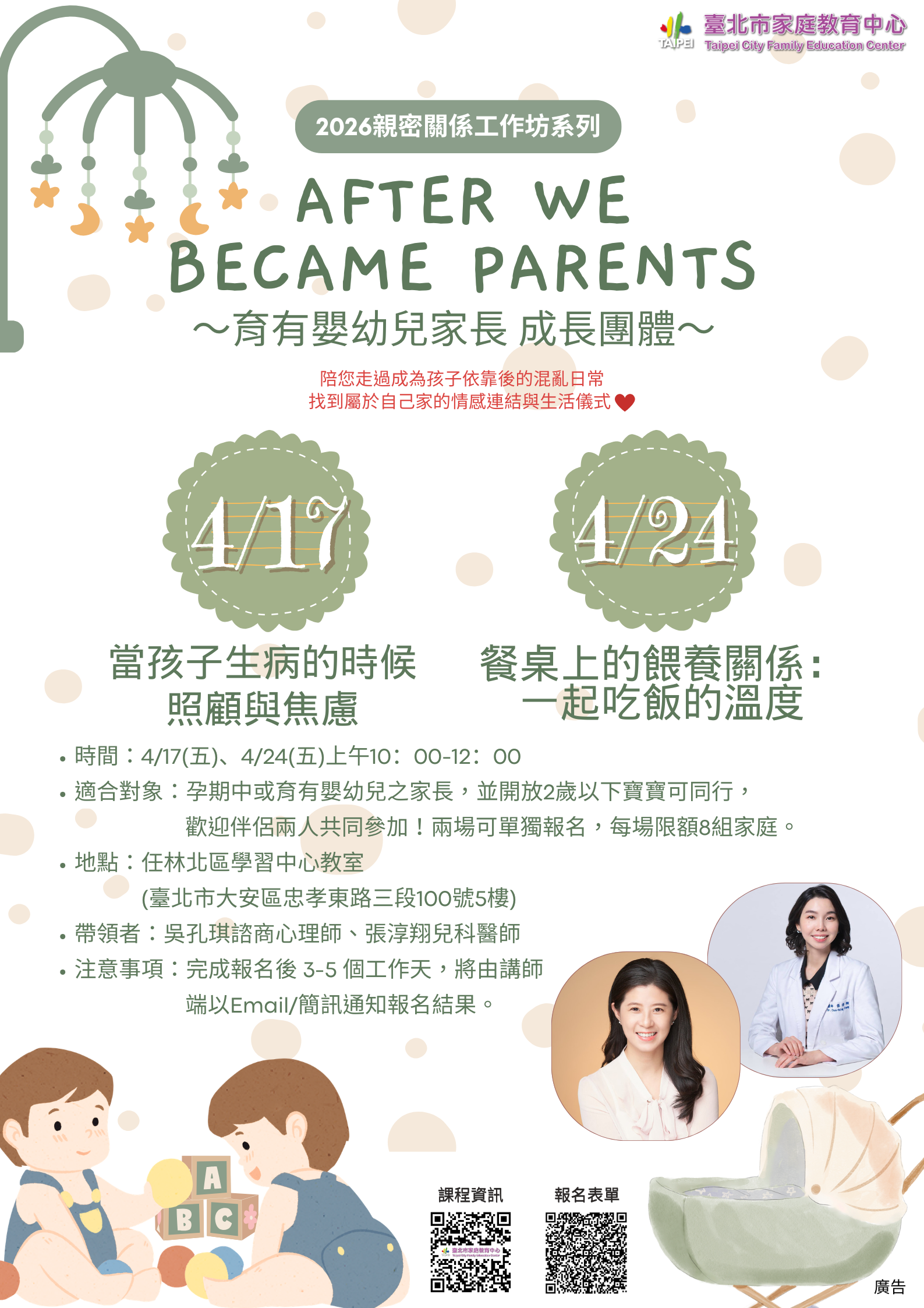 (一)適合對象:孕期中或育有嬰幼兒之家長並開放2歲以下寶寶可同行,歡迎伴侶兩人共同參加,兩場可單獨報名,每場限額8組家庭。